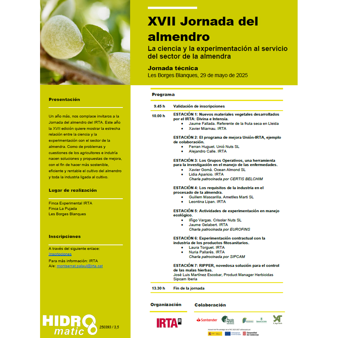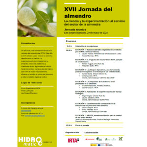 Hidromatic en la XVII Jornada del Almendro celebrada en Les Borges Blanques, un evento de referencia organizado por el Instituto de Investigación y Tecnología Agroalimentarias (IRTA). El encuentro, bajo el lema “La ciencia y la experimentación al servicio del sector del almendro”, puso sobre la mesa la necesidad de unir el conocimiento científico con la práctica agrícola para afrontar los retos del cultivo del almendro.
